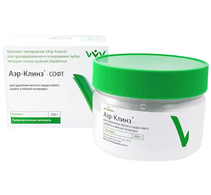 «Аэр-Клинз-СОФТ» - обладает мягкими абразивными свойствами и приятным сладким вкусом. Порошок идеально подходит для снятия мягкого наддесневого налета или для полирования поверхности зуба после удаления зубного камня. Данный материал эффективно и надежно удаляет биопленку и зубной налет вокруг брекетов. Аэр-Клинз-СОФТ это лучшее решение для регулярных профилактических мероприятий и повторных посещений.Форма выпуска