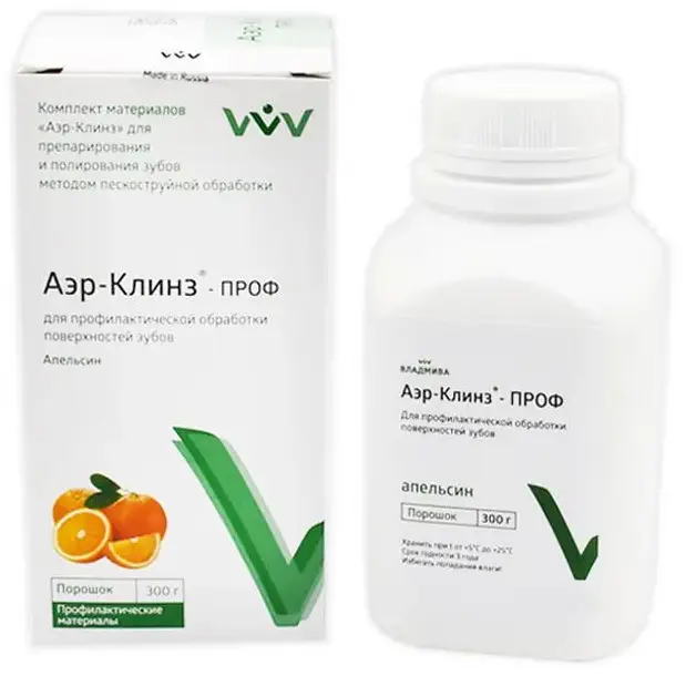 «Аэр-Клинз-ПРОФ» в качестве основного компонента содержит гидрокарбонат натрия с размером частиц, позволяющим провести очистку при щадящем воздействии на твердые ткани зуба. При случайном попадании очищающей струи на десну лидокаина гидрохлорид (0.5%), входящий в состав порошка, обеспечивает безболезненность мягких тканей. Порошок имеет приятный освежающий запах и вкус.Форма выпуска