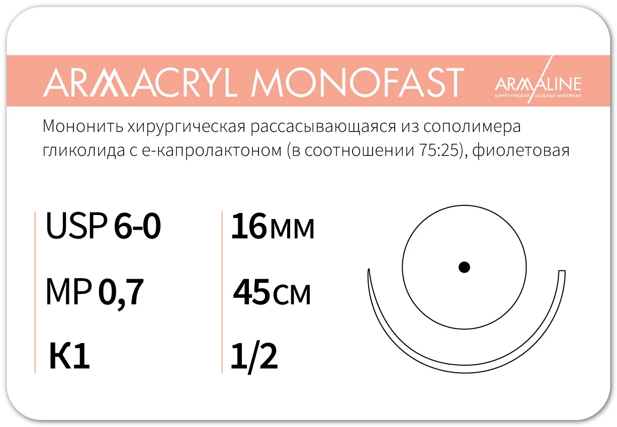ARMACRYL MONOFAST L=45см USP 6/0, игла 16мм 1/2 12шт Armaline