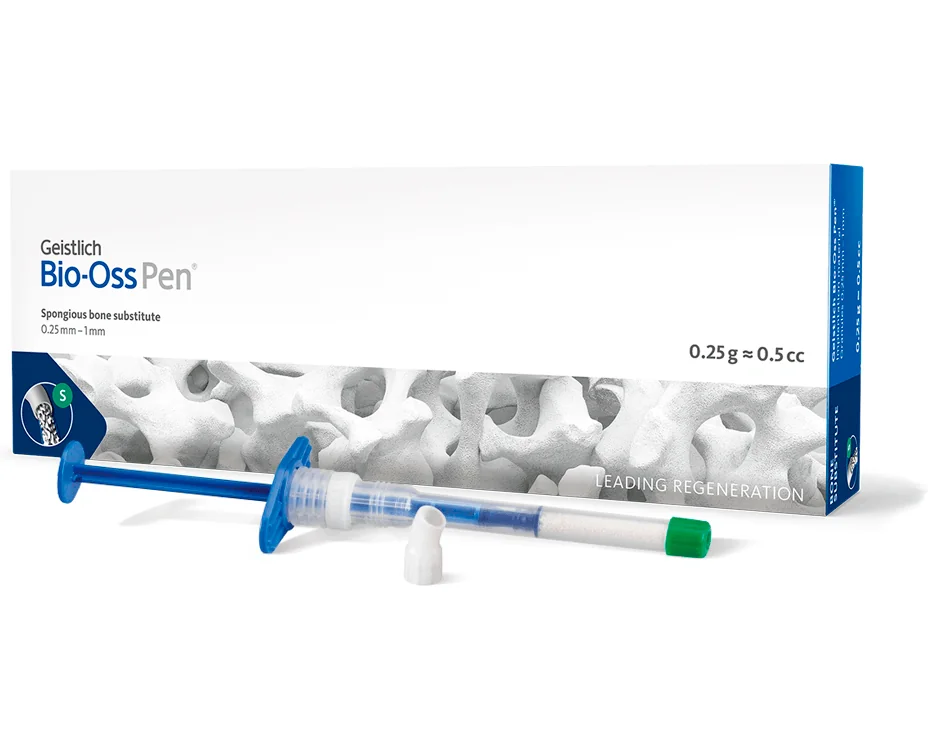 Bio-Oss Pen — это гранулы Bio-Oss (Био Осс), помещенные в удобный аппликатор, который позволяет точно вносить материал в область дефекта без потери гранул и обеспечивает прекрасные манипуляционные свойства.Bio-Oss — натуральный костнозамещающий материал из бычьей кости, по структуре и химическому составу схожий с человеческой костью. Благодаря высокой биофункциональности Bio-Oss способствует васкуляризации и образованию новой кости. Медленная резорбция увеличивает стабильность аугментата, создавая условия для долгосрочной выживаемости имплантатов.