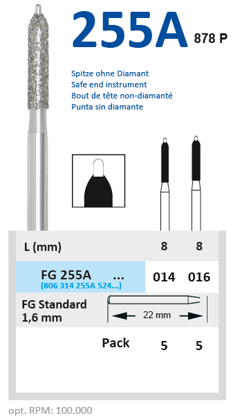 Алмазные боры на гальванической металлической связке для турбинного наконечника FG255A016.Форма бора - торпеда с пином (длина рабочей части - 8 мм, диаметр рабочей части (1/10 мм) - 016).