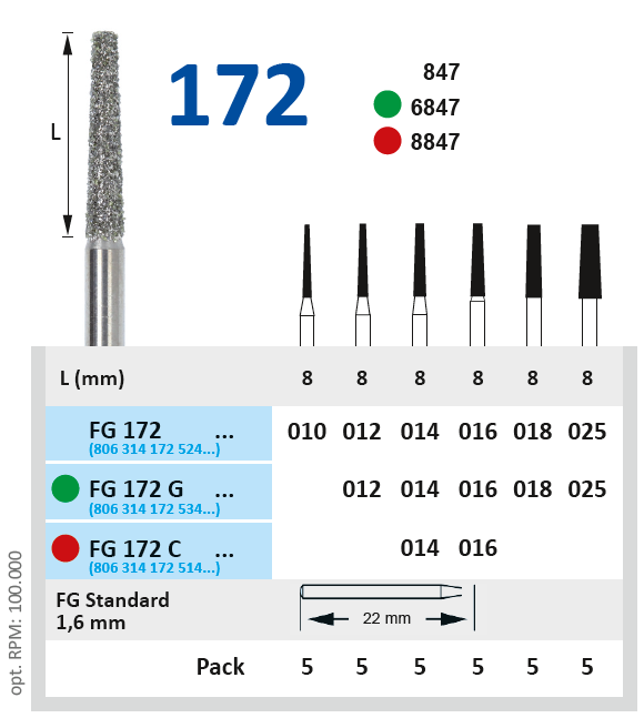 Зернистость боров FG172C016 ~ 45 мкм ("красные" согласно цветовой маркировке), длина - 22 мм, хвостовик стандартный (диаметр хвостовика - 1,6 мм).
