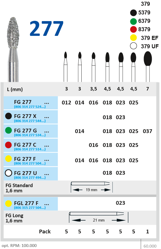 Зернистость боров FG277G037 ~ 120–135 мкм ("зеленые" согласно цветовой маркировке), длина - 19 мм, хвостовик стандартный (диаметр хвостовика - 1,6 мм).