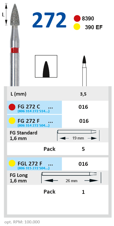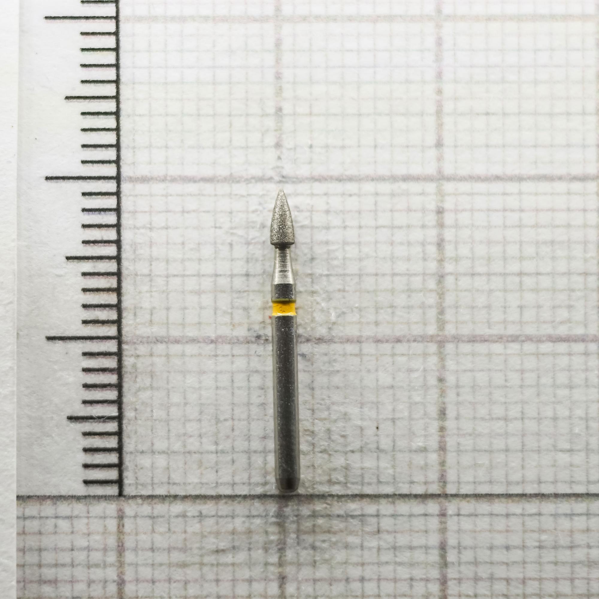 Алмазные боры на гальванической металлической связке для турбинного наконечника FG272F016.Форма бора - пламя (длина рабочей части - 3,5 мм, диаметр рабочей части (1/10 мм) - 016).