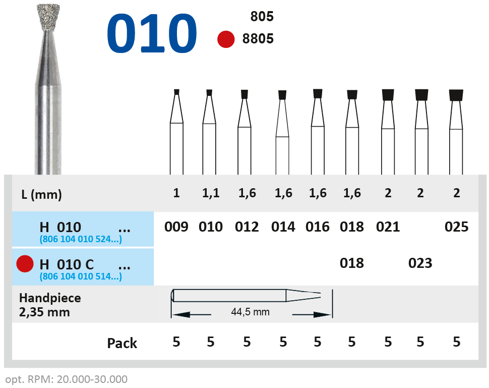 Алмазные боры на гальванической металлической связке для прямого наконечника H010025.Форма бора - обратный конус (длина рабочей части - 2 мм, диаметр рабочей части (1/10 мм) - 025).