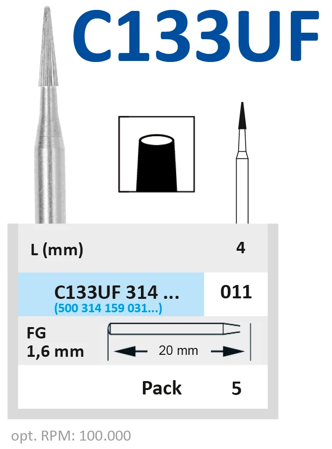Бор твердосплавный финир 30 граней C133UF314011 для турбинного наконечника.Форма бора - конус (длина рабочей части - 4 мм, диаметр рабочей части (1/10 мм) - 011).