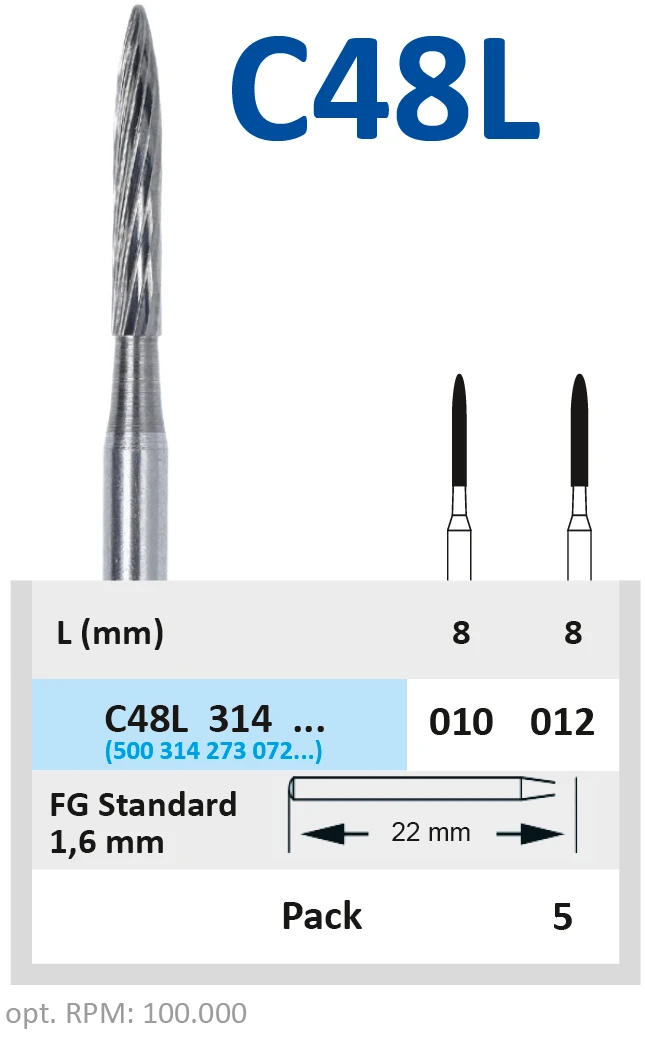 Бор твердосплавный финир 12 граней C48L314010 для турбинного наконечника.Форма бора - пламя удлиненное (длина рабочей части - 8 мм, диаметр рабочей части (1/10 мм) - 010).