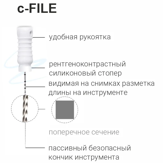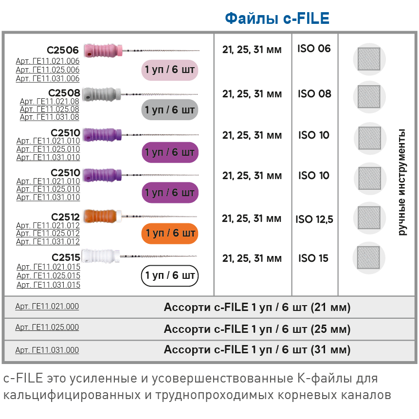 C-File - это усиленные и усовершенствованные K-файлы для кальцифицированных и труднопроходимых корневых каналов. Специально созданы для первичного прохождения узких и облитерированных каналов.Ассортимент