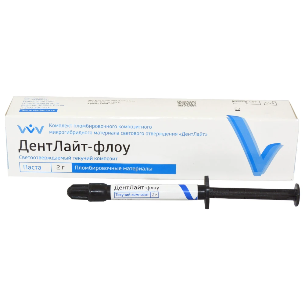 Текучий композитный материал «ДентЛайт» флоу представляет собой средневязкую светоотверждаемую пасту на основе метакрилатных олигомеров и модифицированного тонкодисперсного нанонаполнителя. Рентгеноконтрастный наполнитель представляет собой комбинацию модифицированных барийборалюмосиликатных кластеров (0,1-3 мкм) и наноразмерного диоксида кремния (5-75 нм).Композитная паста выпускается разных цветовых оттенков по шкале VITA (A2, A3, A3.5, А4, B2, C2, ОА3, прозрачный и полупрозрачный/режущий край).