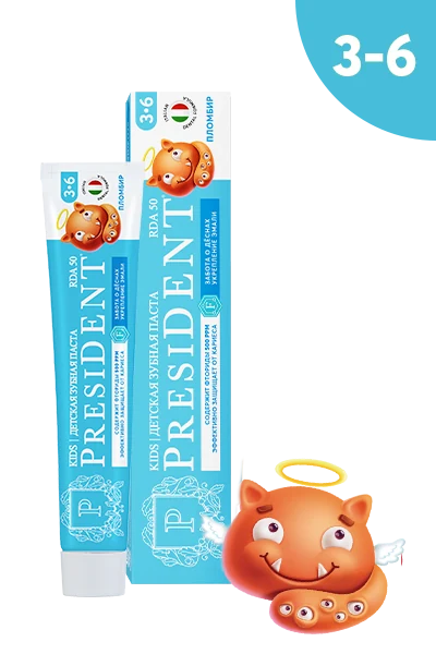 Детская зубная паста PRESIDENT Пломбир от 3 до 6 лет обеспечивает защиту от кариеса, заботу о деснах, укрепление эмали и эффективное очищение. Гелевая форма зубной пасты облегчает очищение в труднодоступных местах.