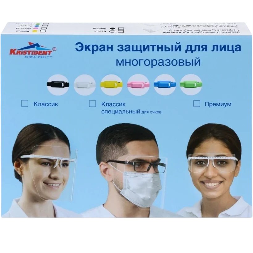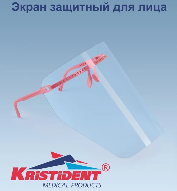Экран защитный для лица многоразовый «КРИСТИДЕНТ» по ТУ 9464-006-66368948-2016 предназначен для защиты лица медицинского персонала от воздействия прямого или частично бокового попадания брызг жидкостей и пыли при использовании в стоматологии и челюстно-лицевой хирургии, а также маникюрном, педикюрном сервисе и косметологии.Преимущества и особенности: