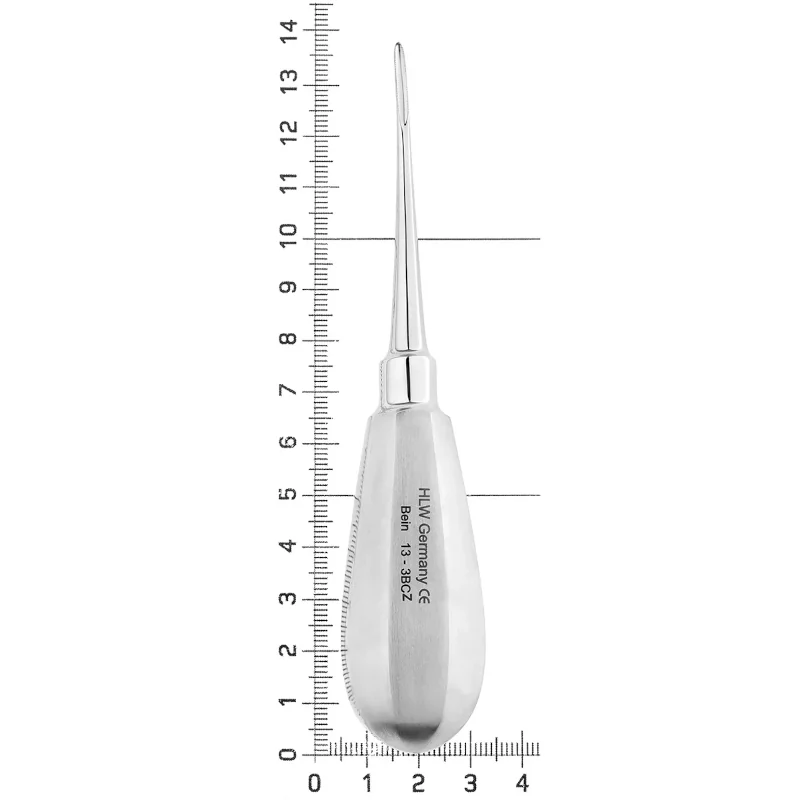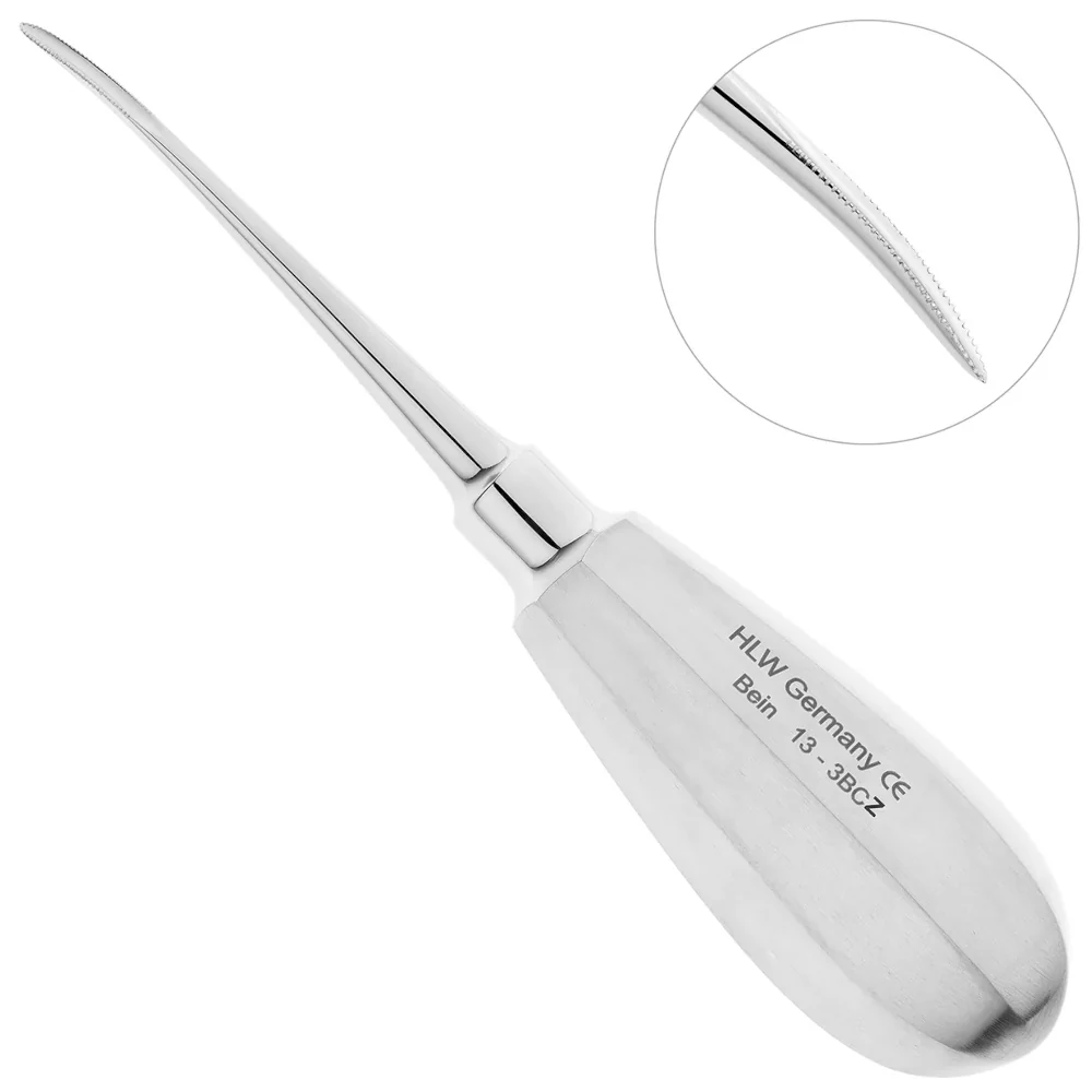 Элеватор конструкции Бейна производства немецкой компании HLW Dental Instruments используется для удаления корней и зубов на верхней и, в ряде случаев, на нижней челюсти.