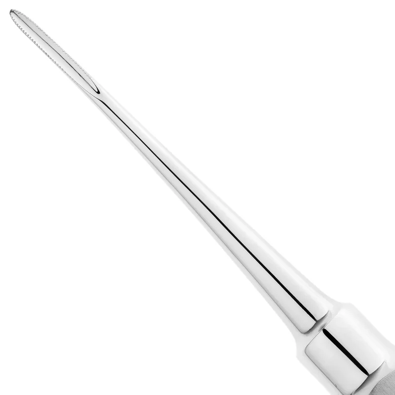 Рабочая часть изогнутого инструмента имеет заостренный край с насечками на внешней поверхности по всей длине и плоскую форму без желоба. Такая конструкция позволяет ввести элеватор в лунку зуба и без затруднений провести операцию по удалению корня или зуба в полости рта. Ширина щечки инструмента 2 мм.