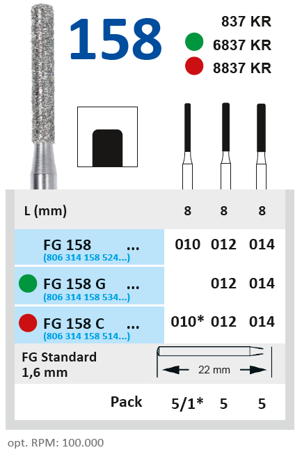 Алмазные боры на гальванической металлической связке для турбинного наконечника FG158C010.Форма бора - цилиндр, закругленные грани (длина рабочей части - 8 мм, диаметр рабочей части (1/10 мм) - 010).
