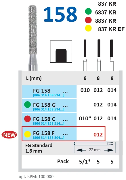 Алмазные боры на гальванической металлической связке для турбинного наконечника FG158F012.Форма бора - цилиндр, закругленные грани (длина рабочей части - 8 мм, диаметр рабочей части (1/10 мм) - 012).