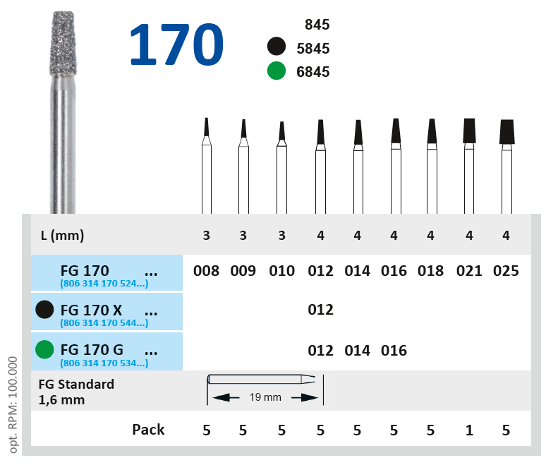 Зернистость боров FG170008 ~ 80-120 мкм ("серые" согласно цветовой маркировке), длина - 19 мм, хвостовик стандартный (диаметр хвостовика - 1,6 мм).
