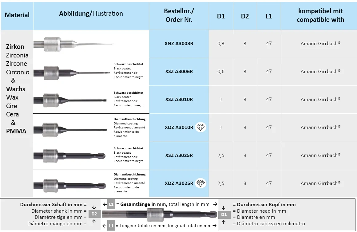 | Описание | Твердосплавная фреза с черным покрытием для CAD/CAM систем Amann Girrbach для обработки циркония, ПММА, воска |