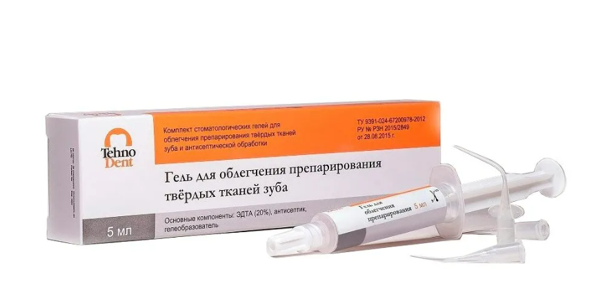 Гель для облегчения препарирования твёрдых тканей зуба - ЭДТА 20% используется для дезинфекции каналов и лечения осложненного кариеса. Препарат обеспечивает удобное и технологичное пломбирование, позволяет сохранять прочностные характеристики зуба, надежную прочность и фиксацию.  Сама процедура препарирования является важным этапом в лечении кариозных зубов, позволяет исключить разрушение твердых тканей.