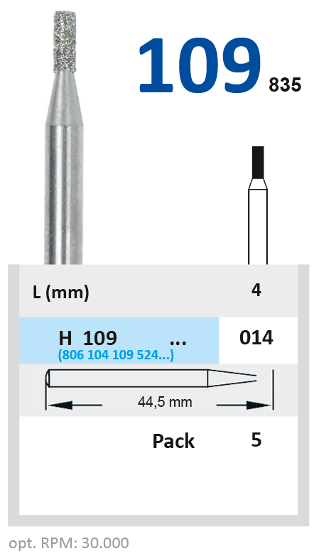 Алмазные боры на гальванической металлической связке для прямого наконечника H109014.Форма бора - цилиндр (длина рабочей части - 4 мм, диаметр рабочей части (1/10 мм) - 014).