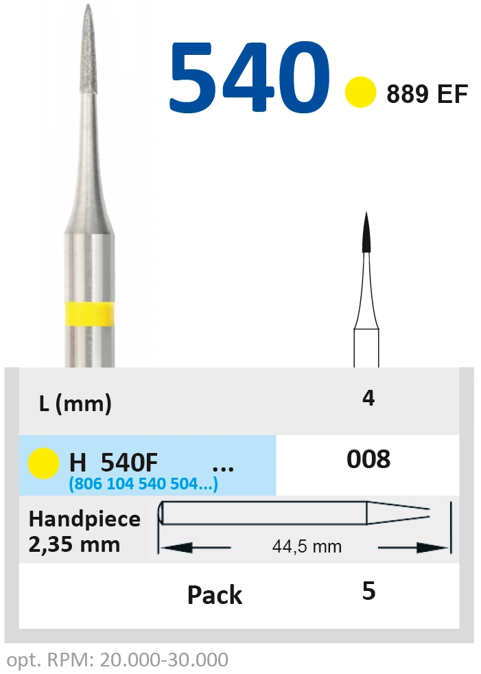 Зернистость боров H540F008 ~ 35 мкм ("желтые" согласно цветовой маркировке), длина - 44,5 мм, хвостовик стандартный (диаметр хвостовика - 2,35 мм).