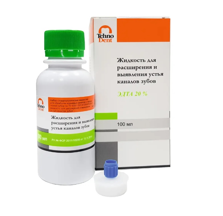Жидкость для выявления устья и расширения корневых каналов зубов (ЭДТА 20%) предназначается для выявления устья корневых каналов, а также их химического расширения при подготовке к пломбированию. Раствор позволяет быстро высушивать и обезжиривать корневые каналы и кариозные полости перед процедурой пломбирования. Может использоваться для обработки зубов под искусственную коронку перед фиксацией протезов.