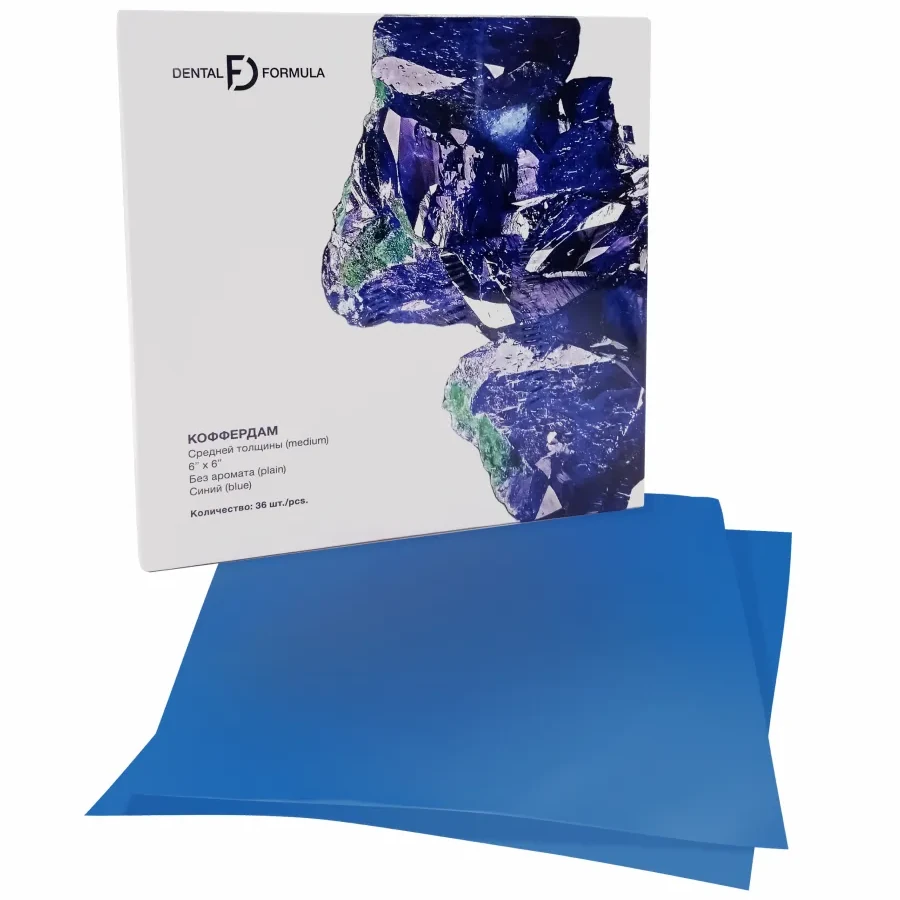 Латексные листы для коффердама Dental Formula средние, синие, без аромата. Гладкая матовая поверхность обеспечивает комфорт при контакте с кожей и слизистой. Латексный коффердам исключает попадания в ротовую полость остатков зубов, используемых материалов, остатков медикаментов, тем самым минимизируя риск развития аллергических реакций на применяемые во время лечения материалы.