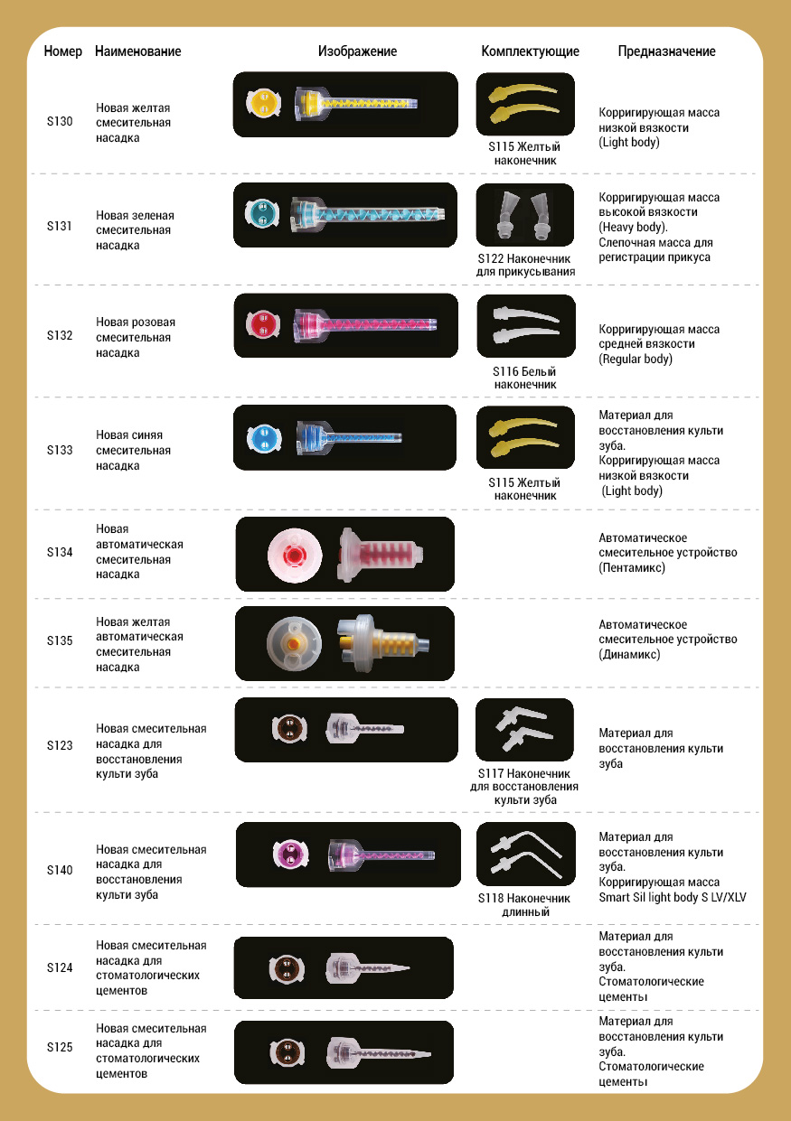 Сочетается с насадками New Core Mix Tip S123, Core Mix Tip S123-A, New Core Mix Tip-B S136, New Core Mix Tip-L S140 корейского бренда SEIL GLOBAL и стандартными насадками других популярных марок. В одной упаковке находится 50 штук наконечников.