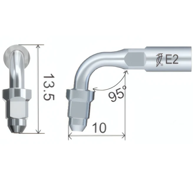 Насадка E2 к скалеру (эндочак) представляет собой держатель под углом 95°, который используется для файла диаметром 0,7 мм или 0,8 мм. Рекомендуется для очистки и промывки корневого канала, обычно используется для моляров. Насадка совместима со скалерами Woodpecker/EMS.