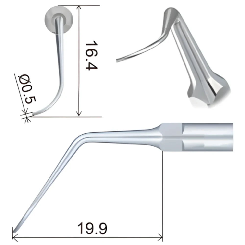 Насадка PD2R, изогнутая под углом в правую сторону, используется для очистки области фуркационных дефектов от зубных отложений.