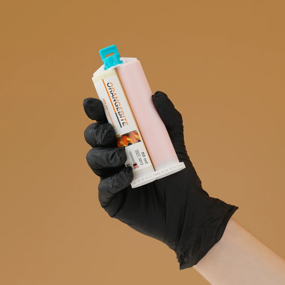 OrangeBite - материал для регистрации прикуса на основе силикона аддитивного типа, быстротвердеющий, обладает высочайшей конечной твердостью и среднетекучей консистенцией.Показания