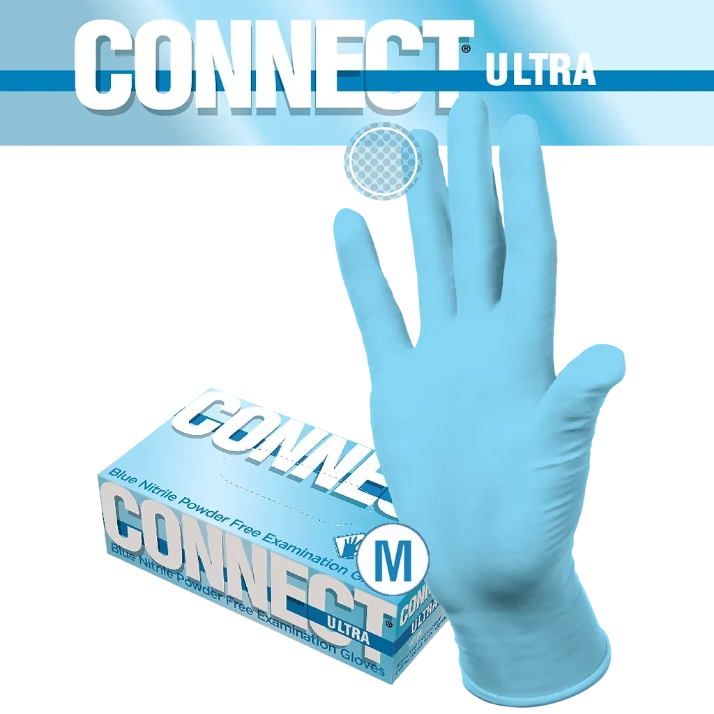 CONNECT ULTRA — смотровые нитриловые неопудренные нестерильные перчатки универсального применения. Изготовлены из 100% синтетического нитрила без латекса и пудры, поэтому подходят людям с аллергией на латекс. Прочные и комфортные, устойчивы к спиртам и дезинфектантам, а текстурированные кончики пальцев обеспечивают надёжный захват.