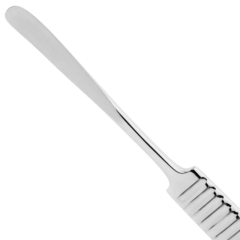 Широкая и плоская ручка инструмента покрыта поперечным, ретенционным, желобовидным рисунком, предотвращающим скольжение фаланг пальцев в перчатке.