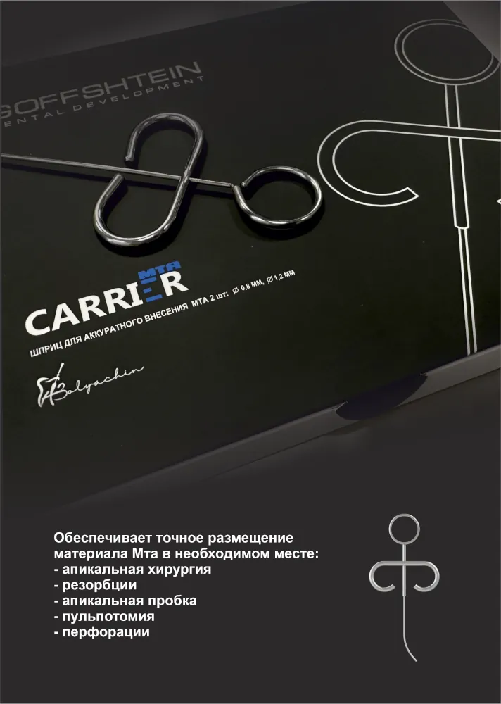 Шприц-дозатор MTA Carrier — высокопрочный инструмент, изготовленный из хирургической нержавеющей стали, используемый для аккуратного внесения МТА. Широкий спектр использования для решения разных клинических задач: от закрытия различных типов перфорации до апикальной хирургии.Изогнутый кончик инструмента позволяет легко внести необходимый объем МТА как в устье корневого канала, так и в область апекса.