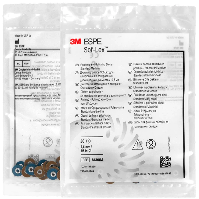 Диски Sof-Lex для шлифования и полирования отлично полируют композиты, в том числе и микрофилы, амальгамы, полудрагоценные и драгоценные металлы. Благодаря низкопрофильному дискодержателю и увеличенной функциональной площади диска система дисков Sof-Lex расширила традиционные области применения шлифовальных и полировальных дисков, позволяя обрабатывать десеневую треть передних и боковых зубов и отдельные жевательные поверхности боковых зубов. Продукция Sof-Lex имеет цветную маркировку от темных тонов (более крупнозернистые абразивы) до светлых тонов (более мелкозернистые абразивы).