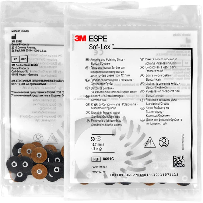 Диски Sof-Lex для шлифования и полирования отлично полируют композиты, в том числе и микрофилы, амальгамы, полудрагоценные и драгоценные металлы. Благодаря низкопрофильному дискодержателю и увеличенной функциональной площади диска система дисков Sof-Lex расширила традиционные области применения шлифовальных и полировальных дисков, позволяя обрабатывать десеневую треть передних и боковых зубов и отдельные жевательные поверхности боковых зубов. Продукция Sof-Lex имеет цветную маркировку от темных тонов (более крупнозернистые абразивы) до светлых тонов (более мелкозернистые абразивы).