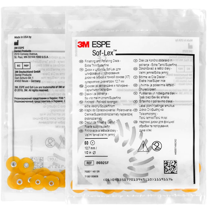 Диски Sof-Lex для шлифования и полирования отлично полируют композиты, в том числе и микрофилы, амальгамы, полудрагоценные и драгоценные металлы. Благодаря своему низкопрофильному дискодержателю и ультратонкой конструкции дисков система Sof-Lex для шлифования и полирования на гибкой и тонкой основе ХТ расширила традиционные области применения шлифовальных дисков, позволяя обрабатывать интраоральные зоны, характеризующиеся ограниченным доступом.Система продемонстрировала высокую эффективность при шлифовании и полировании межзубных промежутков реставраций. Продукция Sof-Lex имеет цветную маркировку от темных тонов (более крупнозернистые абразивы) до светлых тонов (более мелкозернистые абразивы).