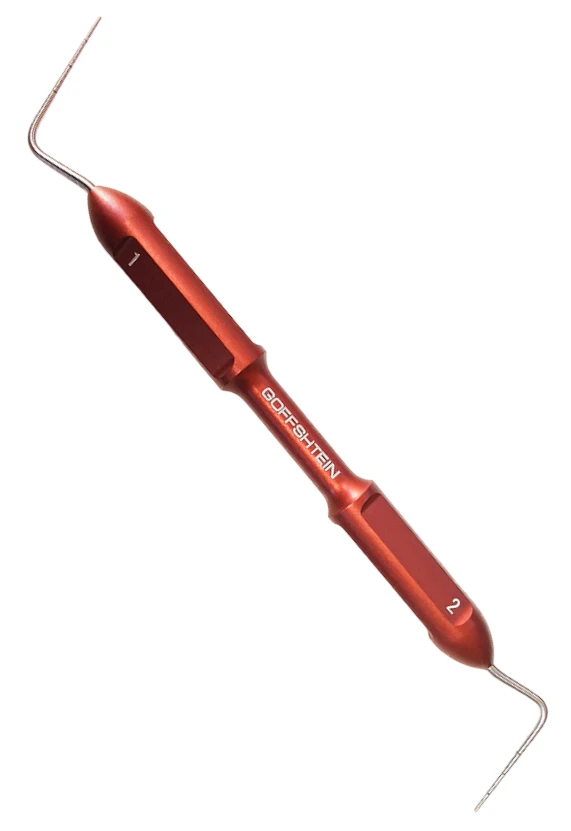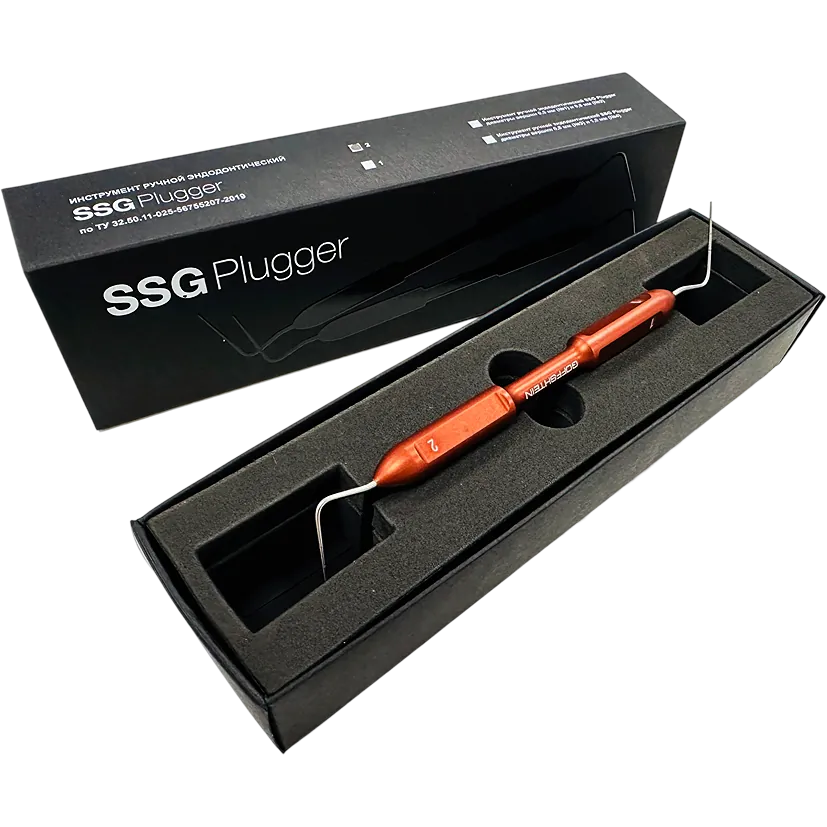 SSG Plugger - ручной эндодонтический инструмент, предназначенный для пломбирования корневых каналов методом вертикальной и латеральной компакции (уплотнения) разогретой гуттаперчи в корневом канале.Рабочие части стержня инструмента градуированы насечками на расстоянии 05, 1, 1.5, 2мм от вершины инструмента для удобства определения длины его погружения в корневой канал.
