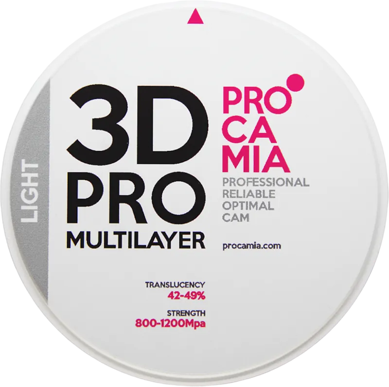 Procamia 3D Pro ML Light — цирконий суперпрозрачный, многослойный, окрашенный послойно от супер до ультра прозрачного, выполненный в более лёгких и менее цветонасыщенных тонах, которые делают его идеальным инструментом для работ под детализацию либо для высокоэстетичных и ультрапрозрачных по режущему краю работ.Стоматологические циркониевые заготовки 3D Pro Multilayer Light предназначены для изготовления реставраций фронтального, жевательного и зубного ряда, а также высокоэстетичных монолитных коронок и мостов любой протяженности и расположения.