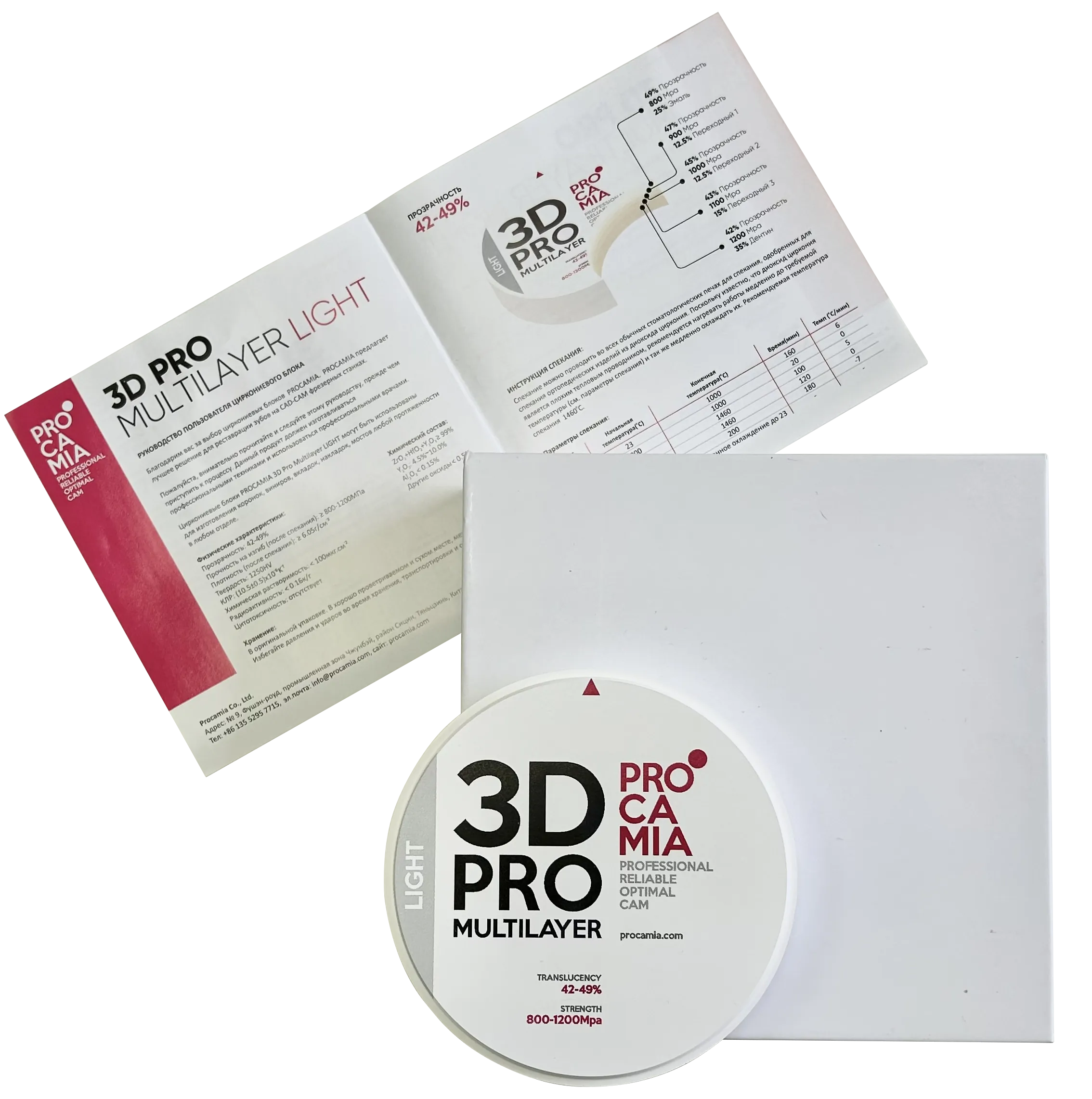 Procamia 3D Pro ML Light — цирконий суперпрозрачный, многослойный, окрашенный послойно от супер до ультра прозрачного, выполненный в более лёгких и менее цветонасыщенных тонах, которые делают его идеальным инструментом для работ под детализацию либо для высокоэстетичных и ультрапрозрачных по режущему краю работ.Стоматологические циркониевые заготовки 3D Pro Multilayer Light предназначены для изготовления реставраций фронтального, жевательного и зубного ряда, а также высокоэстетичных монолитных коронок и мостов любой протяженности и расположения.