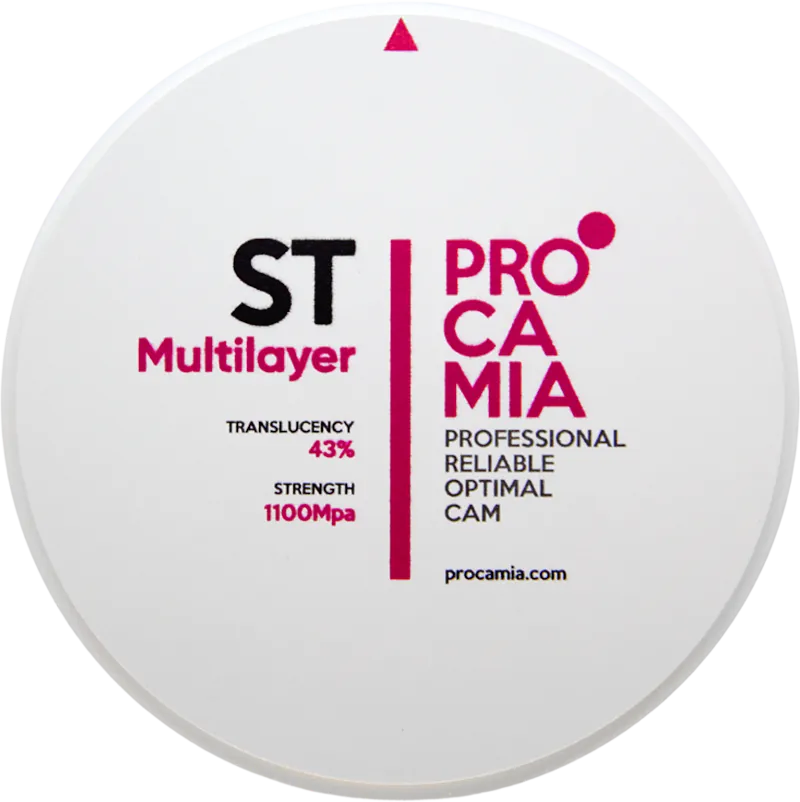 ST Multilayer Procamia — это стоматологические диски, предназначенные для фрезерования реставраций из циркония, отличающиеся от обычных многослойной структурой. Эти диски специально разработаны для обеспечения естественного градиента цвета и прозрачности, что позволяет создавать более эстетически привлекательные зубные реставрации.Диски имеют несколько слоев, каждый из которых имеет свой цвет, что позволяет добиться более натурального и гармоничного вида реставраций. Как и другие циркониевые диски Procamia, ST Multilayer безопасны для использования в ротовой полости и не вызывают аллергических реакций.