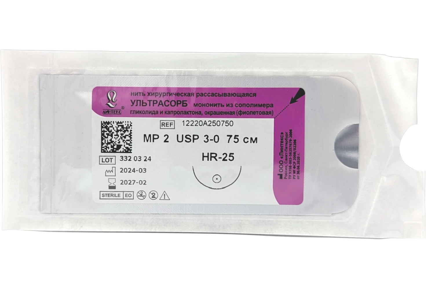 УЛЬТРАСОРБ - мононить рассасывающаяся, L=75см, USP 3/0, HR-25, "Линтекс"