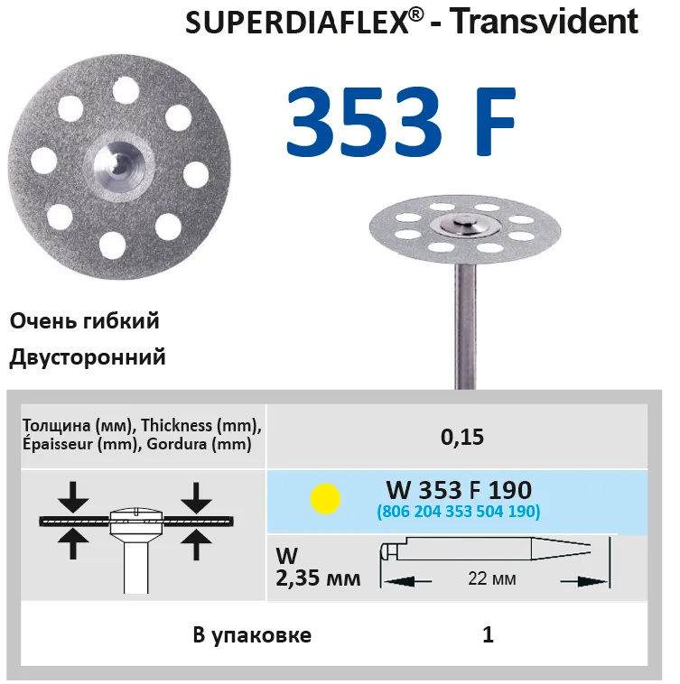 Диск алмазный, двухсторонний, перфорированный, очень гибкий для работы с керамикой и акрилом.Диск для углового наконечника, длина - 22 мм, толщина рабочей части - 0,15 мм, диаметр рабочей части - 19 мм.